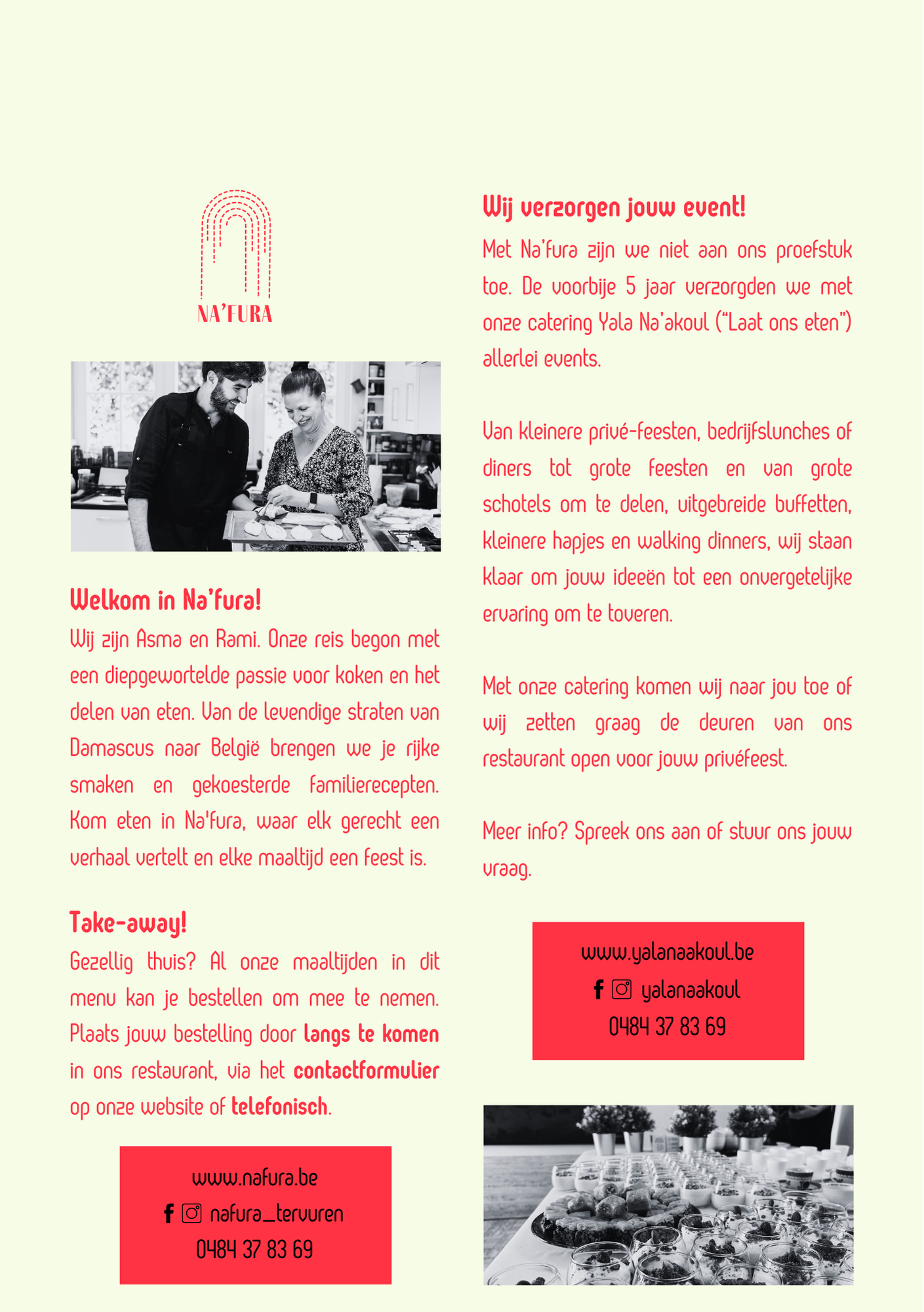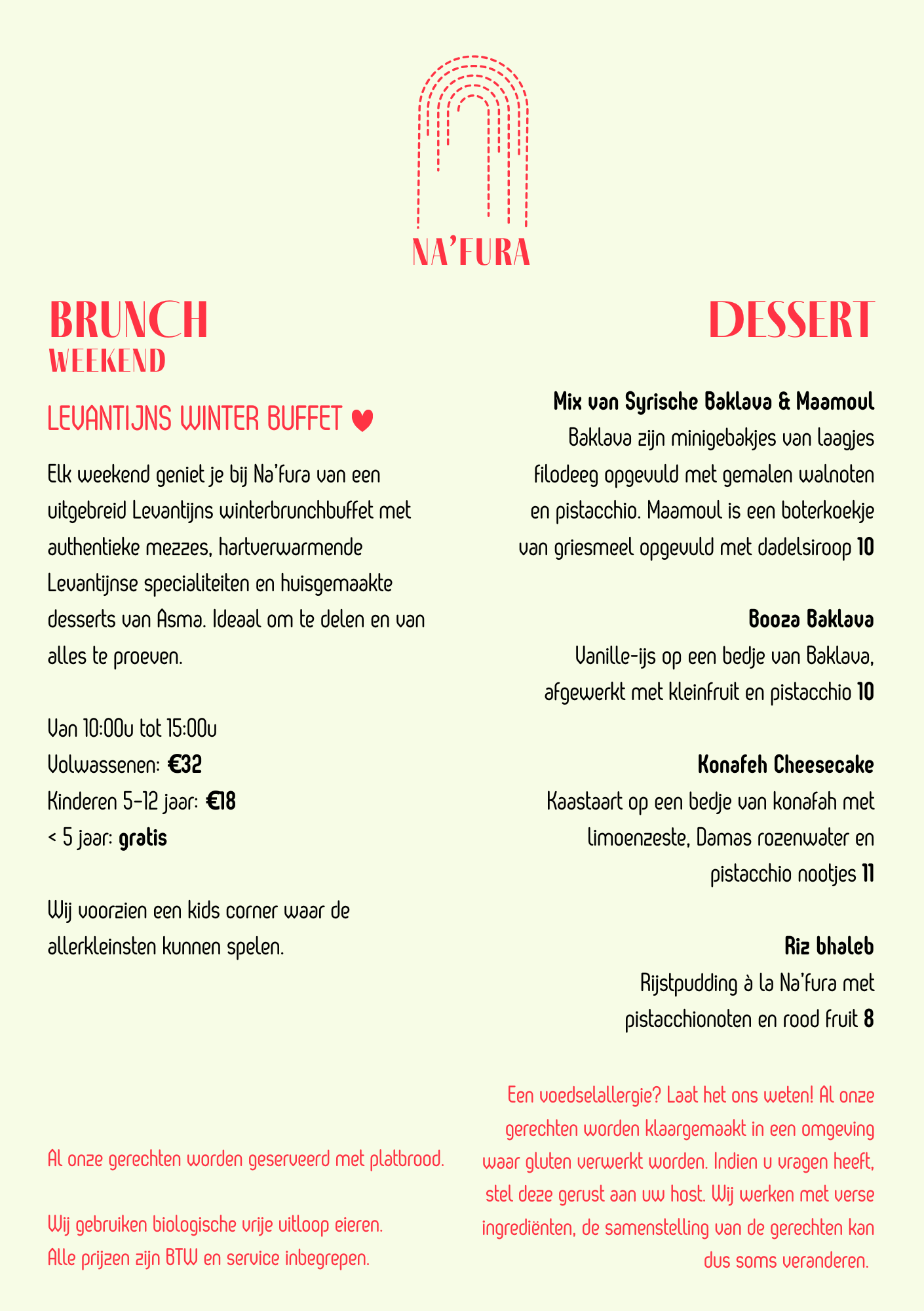 De afbeelding toont een menu voor een vegetarisch en veganistisch restaurant met de titel 'Mezze to Share'. Het menu vermeldt dat alle gerechten worden geserveerd met platbrood. Er is een gerecht 'Mezze Na'fura' met hummus, Baba Ganoush, sambousek en falafel, geserveerd met salade. De tekst benadrukt dat de gerechten in een glutenvrije omgeving worden klaargemaakt en dat ze biologische vrije uitloop eieren gebruiken, met prijzen inclusief BTW en servicekosten.